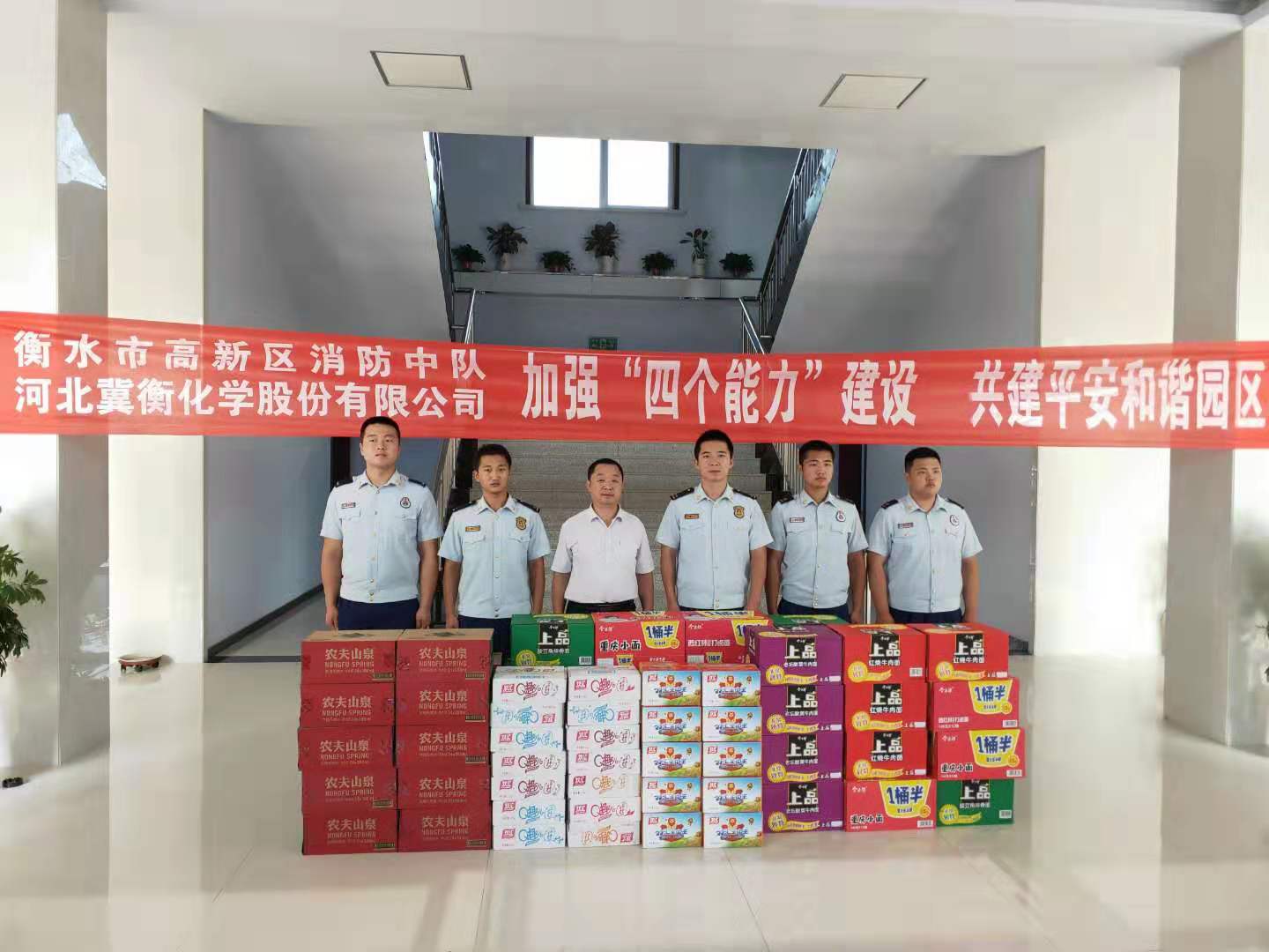 7月31日下午,我公司安全管理部曹云輝主任代表公司領導,走訪慰問了衡水市高新區消防中隊官兵,并送去了飲用水等防暑降溫物品, 盡顯了軍民魚水之情。在慰問中曹主任對消防中隊官兵對冀衡化學給予的大力支持和幫助表示衷心感謝,冀衡化學作為消防重點單位,各項工作得到了市、區消防支隊和大隊的服務及指導,雙方多次進行消防演練,共同提高消防應急協作能力,希望在今后的工作中繼續保持良好的警民合作共建關系,互相支持,互相合作,進一步加強“四個能力”建設,共同建設和諧平安園區。