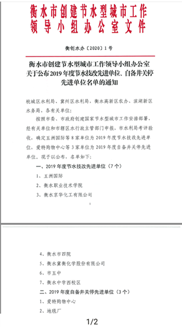 近日,我公司被衡水市創建節水型城市工作領導小組評為2019年度節水技改先進單位。