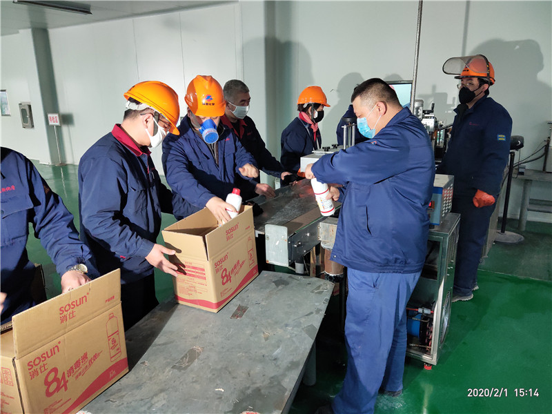 公司黨員突擊隊在84消毒液生產(chǎn)現(xiàn)場