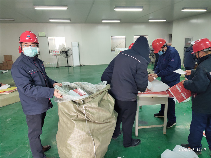 疫情爆發(fā)以來,冀衡化學(xué)公司充分發(fā)揮黨組織戰(zhàn)斗堡壘作用和黨員先鋒模范作用,全面部署、迅速行動、周密安排,嚴(yán)密防控,全體黨員在崗在位,黨員干部沖鋒在前,以黨建引領(lǐng),堅決打贏新冠肺炎疫情防控阻擊戰(zhàn),在做好公司防控工作的同時,公司全體黨員自愿組成黨員突擊隊,加班加點不計報酬,義務(wù)勞動灌裝消毒液產(chǎn)品,倒裝消毒顆粒產(chǎn)品,協(xié)助政府打好防控消毒戰(zhàn)!