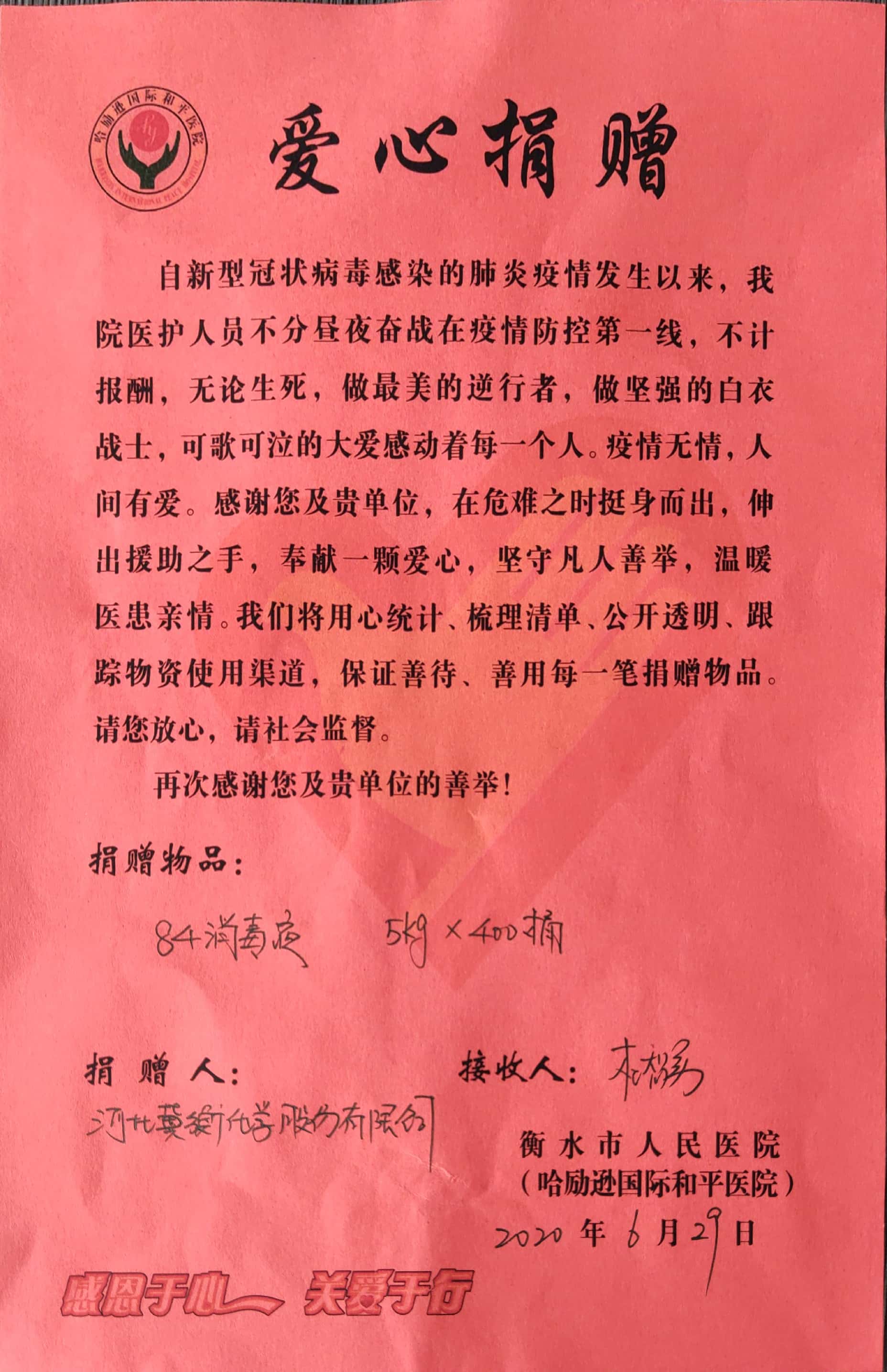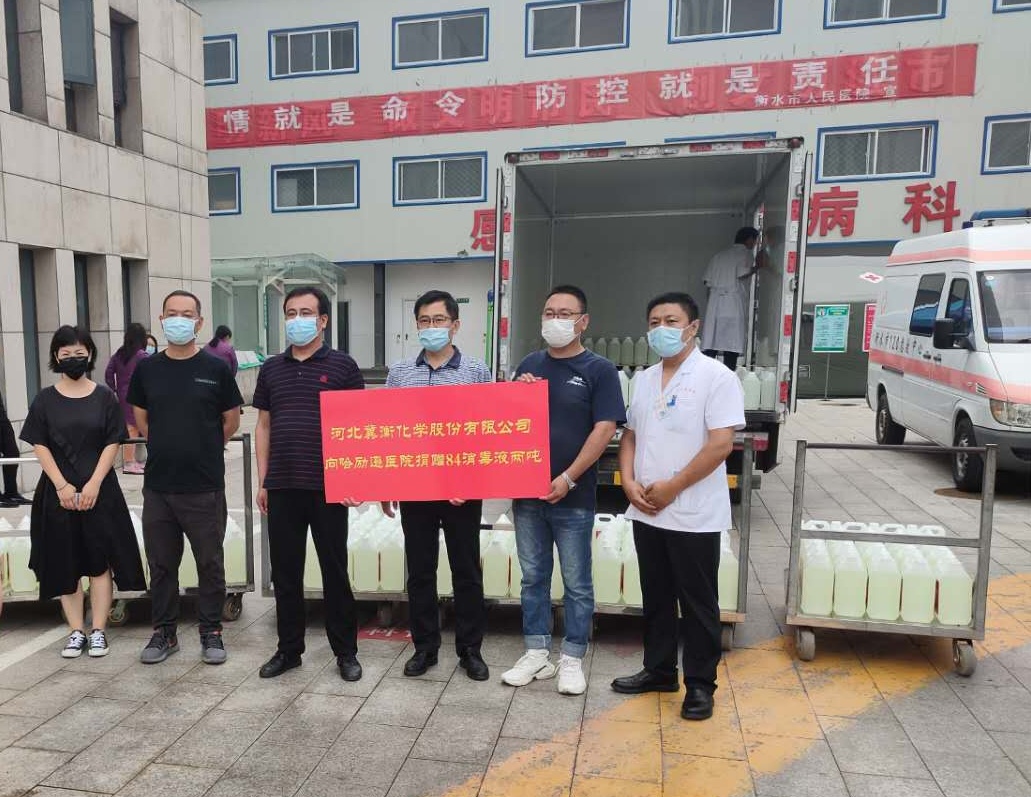 6月29日上午,公司宋英健副總經(jīng)理一行來到衡水市人民醫(yī)院,代表我公司向人民醫(yī)院捐贈84消毒液兩噸,人民醫(yī)院有關(guān)領(lǐng)導(dǎo)接受了捐贈,并對我公司表示感謝。宋總表示,作為河北省防疫物資重點(diǎn)生產(chǎn)企業(yè),我公司將繼續(xù)關(guān)注疫情發(fā)展,繼續(xù)助力疫情防控,相信在全社會的共同努力下,我們一定能夠戰(zhàn)勝病毒,取得新冠病毒疫情阻擊戰(zhàn)的勝利。