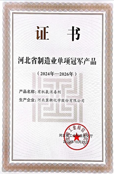 近日,河北省工業(yè)和信息化廳公布了《2024年河北省制造業(yè)單項(xiàng)冠軍企業(yè)名單》,河北冀衡化學(xué)股份有限公司憑借其在有機(jī)氯消毒劑行業(yè)領(lǐng)先的制造技術(shù)和全球領(lǐng)先的市場份額,榮獲“河北省制造業(yè)單項(xiàng)冠軍產(chǎn)品”稱號(hào)。